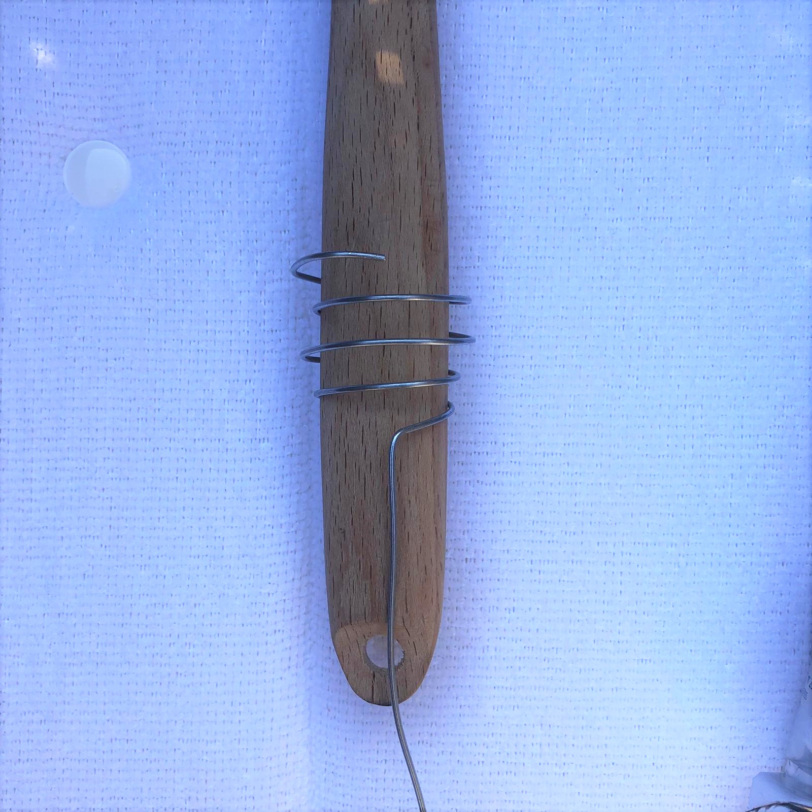 Vervolgens ga je aan de slag met het ijzerdraad. Het is aan jezelf om in te schatten hoe groot het spiraal moet worden, want het luchtplantje moet er natuurlijk wel in passen. Om het jezelf makkelijk te maken, kun je een pollepel gebruiken om het ijzerdraad omheen te spannen. Zo zorg je ervoor dat je spiraal gelijke bogen/rondes heeft.