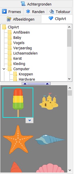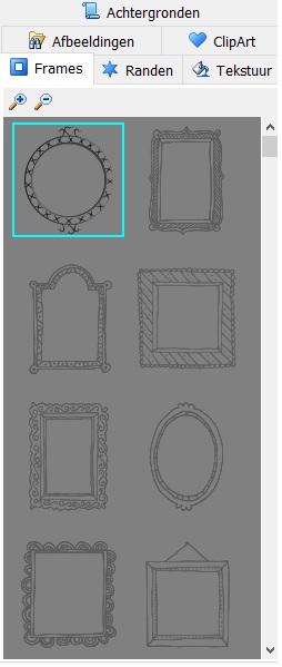 Links in het programma zie je het gedeelte waar je je foto’s kunt selecteren en in het programma kunt zetten. Ook zie verschillende tabbladen, met frames, randen, tekstuur en clipart. De keuze is reuze en je kunt als liefhebber helemaal los gaan met het kiezen en maken van je fotoboek.
