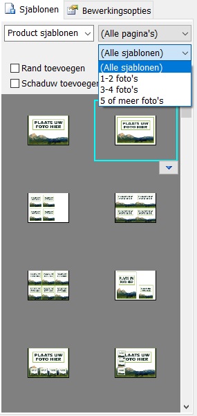 Rechts van het programma zie je de verschillende sjablonen die je kunt gebruiken om de bladzijdes te vullen. Bij de sjablonen kun je kiezen uit enkele of dubbele pagina’s en je kunt ook de hoeveelheid foto’s in het sjabloon kiezen. Zo hoef je niet lang te zoeken, je zet gewoon even een filtertje uit. Handig!