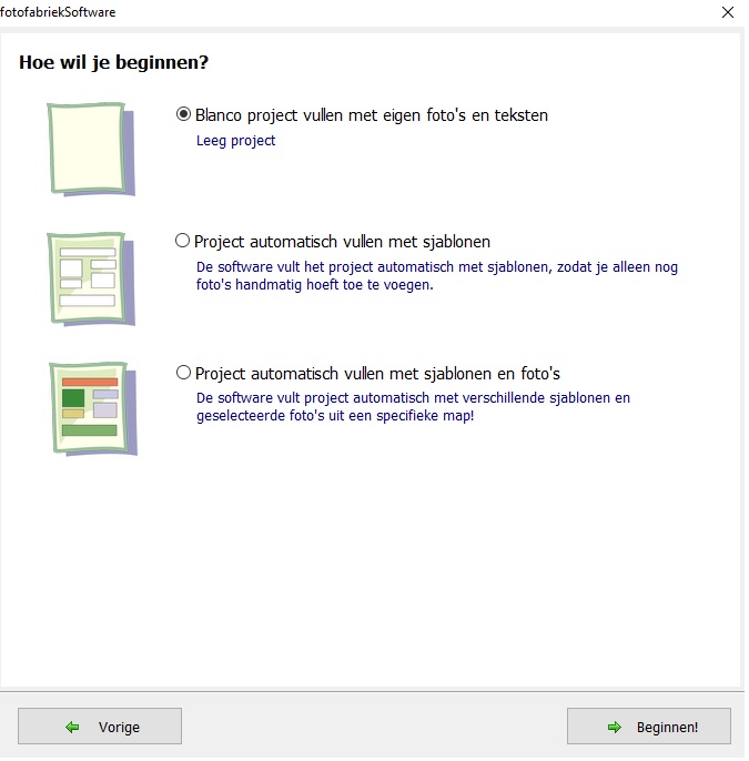 Wanneer het programma geïnstalleerd en opgestart is, kun je in principe beginnen! Je klikt op nieuw project en kiest het product wat je wilt maken. Als je dus net als ik een fotoboek gaat maken, kun je ervoor kiezen om het project automatisch te laten vullen met sjablonen, met sjablonen en foto’s of dat je helemaal blanco wilt beginnen. Klik op je keuze en voilà: je kunt aan de slag!