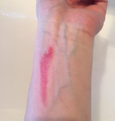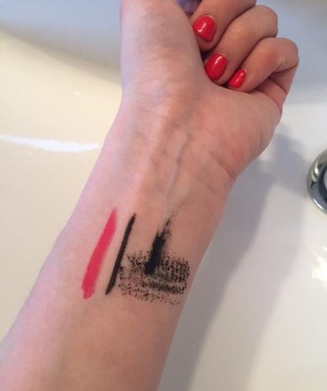 Op de linkerfoto zie je dat ik longlasting lipstick, waterproof eyeliner en waterproof mascara heb aangebracht op mijn arm. De middelste foto laat zien hoe het product schuimt (hallo SLES) en de rechter foto laat zien wat er op mijn arm blijft zitten aan make-up. De micellaire gel laat zowel de mascara en eyeliner als sneeuw voor de zon verdwijnen, maar van de lipstick blijft toch nog aardig wat op mijn armen zitten. Geeft niks, want met een wattenschijfje en wat micellair water krijg ik de restjes er van af.